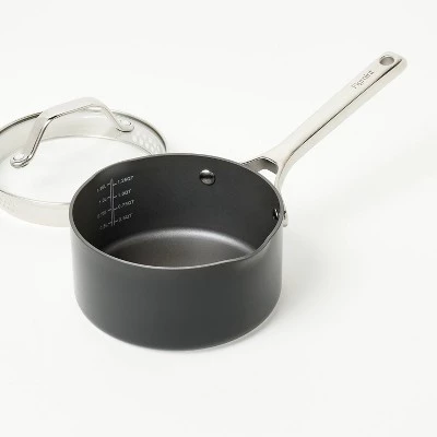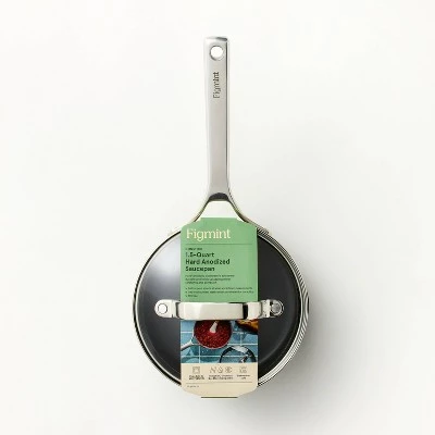 Cook up sauces, soups, pasta dishes and more with ease with this 1.5-Quart Nonstick Hard Anodized Aluminum Sauce Pan with Straining Lid from Figmint™. Featuring a hard anodized aluminum construction that’s ideal for even heat distribution and resists minor scratches and corrosion, this sauce pan also has a smooth, long-lasting nonstick coating (to protect the nonstick coating, use only with silicone, nylon or wood cooking utensils). The pan is induction, gas and electric stove compatible and oven safe up to 450 degrees — and best of all, it also comes with a built-in spout and a convenient straining lid.