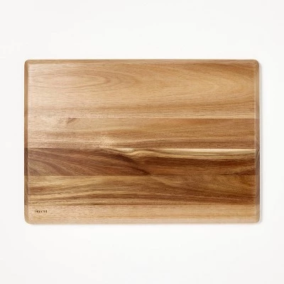 Add an elegant and versatile carving surface to your kitchen with this 14-Inch x 20-Inch Acacia Wood Carving Board with Juice Groove from Figmint™. Made from acacia wood, the carving board’s natural finish offers a clean, lovely look, and the reversible design means you can use both sides. Tapered edges make it easy to lift off your countertop, helping to reduce dropped ingredients, and integrated juice grooves minimize mess and make hand washing easier.