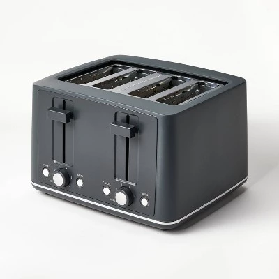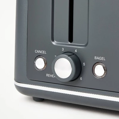 This 4-Slice Painted Stainless Steel Toaster with Thin Chrome Trim Band from Figmint™ gives you a variety of functions for convenient, versatile use. Designed in gray with a thin chrome trim band at the bottom, this four-slice toaster is designed with wide slots for toasting any of your favorite breads or bagels. It features seven browning settings as well as reheat, bagel and cancel functions, and the anti-jam technology and high-lift lever offer easy removal. The removable slide-out crumb tray makes the toaster easy to clean, and an auto shut-off function provides you with some extra peace of mind.