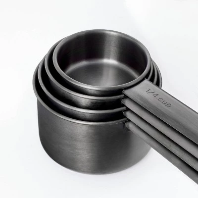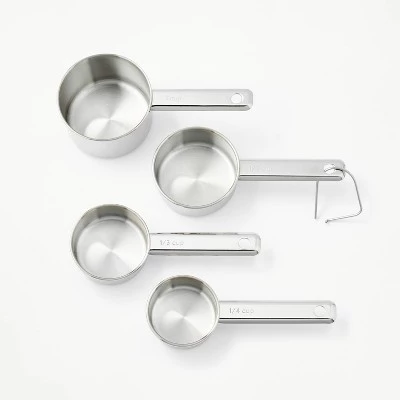 This 4-Piece Stainless Steel Measuring Cups Set from Figmint™ makes it easy to measure out ingredients for any recipe you choose. Made from stainless steel in a solid hue, these measuring cups are built to last and easy to maintain, and they feature hanging handles and come with a metal ring for easy storage. The set includes 1/4 cup, 1/3 cup, 1/2 cup and 1 cup measurements, and their dishwasher-safe construction makes them all easy to clean.