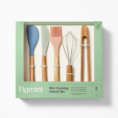 This 5-Piece Acacia Wood/Silicone Mini Kitchen Utensil Set from Figmint™ gives you five kitchen essentials to tackle a variety of cooking and baking tasks. Including a spatula, jar scraper, basting brush, whisk and tongs, this miniature kitchen utensil set is heat resistant and BPA free. Ergonomic acacia wood handles offer easy, comfortable use, and flexible silicone heads are stick resistant, great for scraping and won’t scratch metal cooking surfaces.